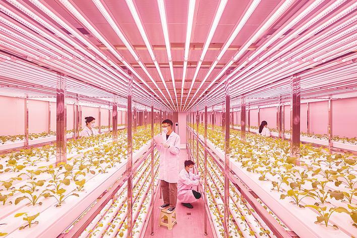 在中国农科院油料所植物工厂内,科研人员定期维护油菜植株,并观察记录。(湖北日报全媒记者 任勇 摄)